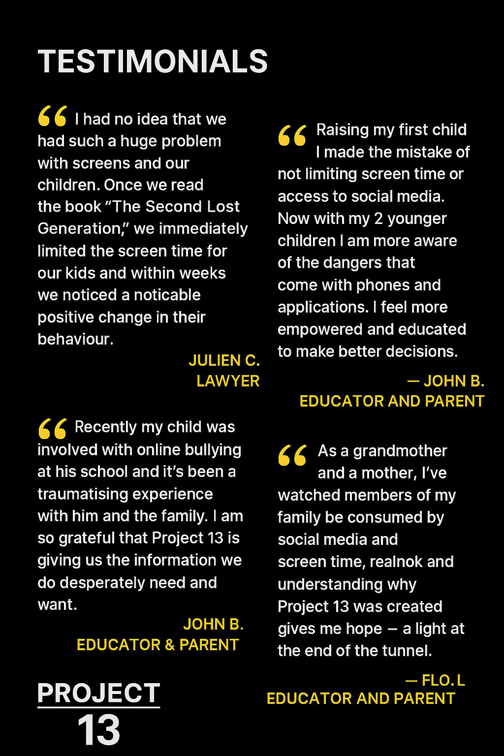 Adolescents are under siege manipulated by algorithms, hooked by design, and left unseen in a world that never stops scrolling.Project 13 exists to prepare, protect, and equip those on the front lines: